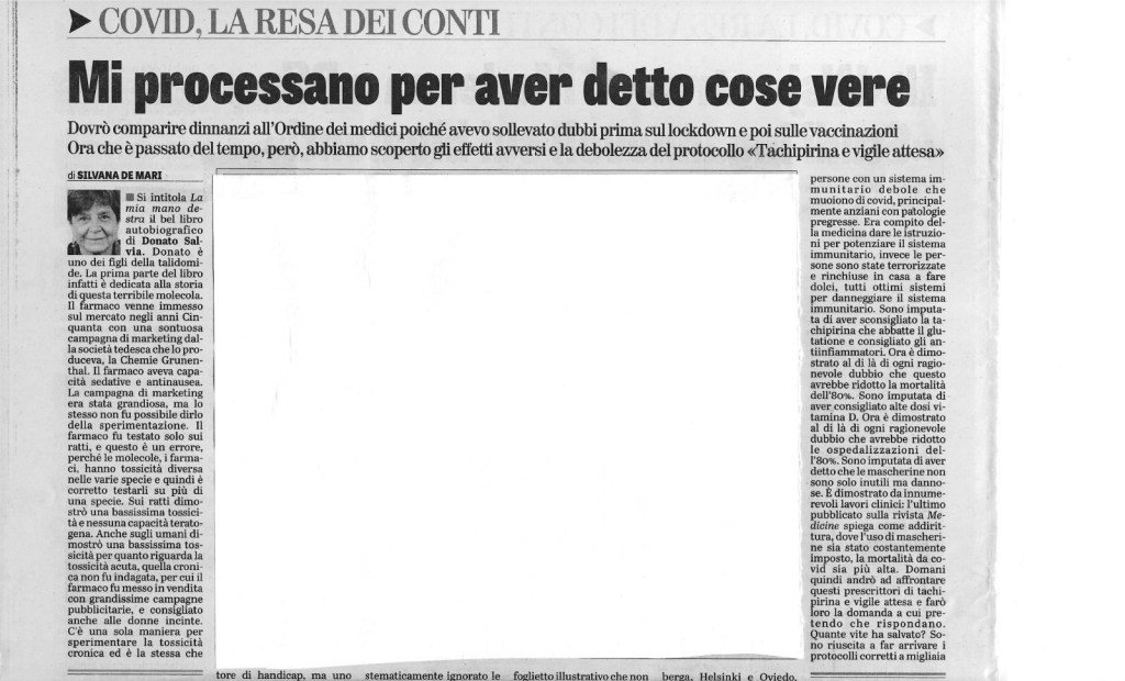 Oggi sul quotidiano la Verità, la dott.ssa Silvana De Mari ha parlato del mio libro, La mia mano destra. Conosciuta mentre mi chiedeva di autografarle i miei libri che aveva diligentemente comperato, la Dottoressa, ospite principale della serata ha poi tenuto dopo di me la sua “performance”. Io avevo parlato di Talidomide e dello spettacolo che si era appena concluso sul mio libro, e lei di vaccini e quant’altro.